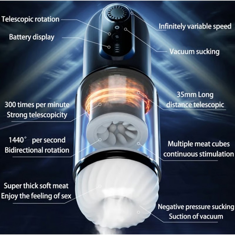 Это уникальная игрушка с комбинацией всасывания, телескопического вращения и возвратно-поступательных движений вместе с удобным и простым управлением - плавным вращением колесика на игрушке!