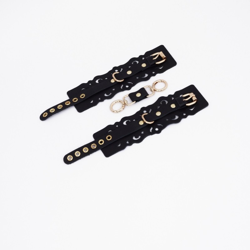 Наручники с узорным дизайном из натуральной кожи с золотой фурнитурой. Резные элементы придают атмосферу нежности, элегантности и подчеркивают красоту тела. Регулируются ремешком, а также в комплекте прочный соединитель с двумя карабинами.