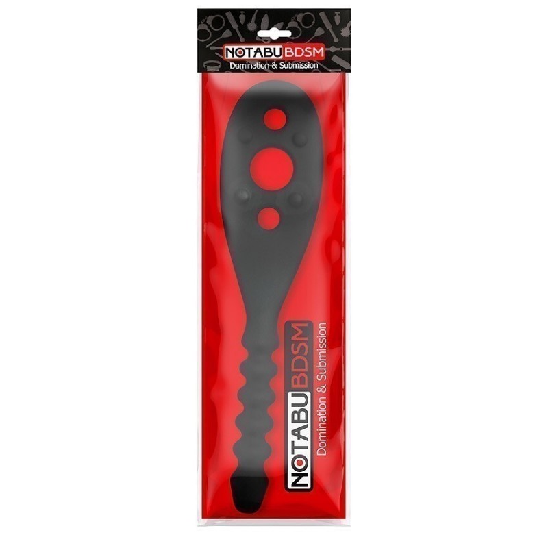Двойной БДСМ аксессуар для любителей нестандартных эротических развлечений. Совмещает в себе шлёпалку и анальную втулку. Шлёпалка имеет широкую рабочую поверхность с жёсткими шипиками, усиливающими эффект от спанкинга. На шлёпалке имеются отверстия разного диаметра, которые могут отпечатываться на коже. Втулка имеет эргономичную форму ёлочки, способствующую более комфортному введению.