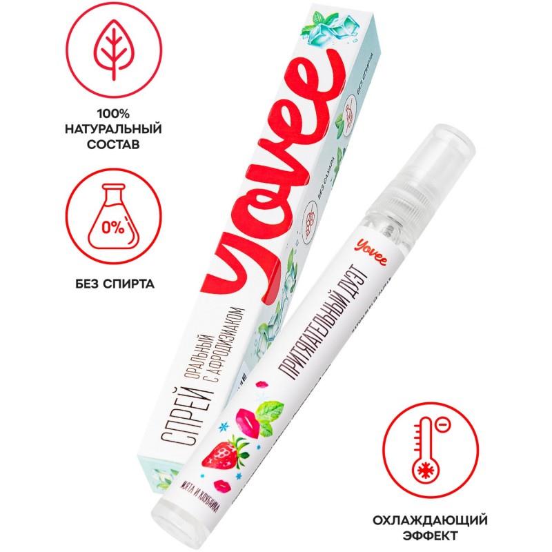 Обладая соблазнительным мятно-клубничным вкусом и приятным охлаждающим эффектом спрей Yovee «Притягательный дуэт» усиливает удовольствие от секса и делает интимную игру еще более пикантной.