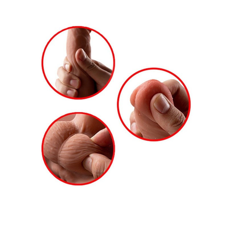 Секс-игрушка выглядит максимально реалистично. Половой член может наклоняться в разные стороны, позволяя использовать изделие в разных позах. Внутри пениса находится жёсткий стержень. Сам интимный аксессуар не имеет внутреннего каркаса, прекрасно мнётся и сжимается. Яркая коробка наглядно демонстрирует все возможности девайса.